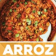 Rich and savory Arroz Con Pollo with delicious tomato flavor, juicy chicken, tender rice, lots of herbs and spices, plenty of lime juice, and a handful of jalapeño-stuffed green olives. Bright and spicy and comforting!
