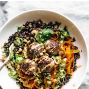 4. Bowls: Layer the carrots and meatballs over cooked quinoa. Top with herbs, peanuts, and/or spicy mayo.