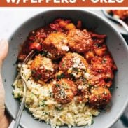 Not to be dramatic but in my experience there’s something magical about the combination of panko and Parmesan loaded quick chicken meatballs (remember these Baked Chicken Meatballs?), tangy tomato sauce with garlic and sautéed peppers, and a silky-creamy-delicious pile of hot orzo on the side. This is the kind of recipe that just calls you straight home to the dinner table, you know? And there’s even more where this meatball/orzo combo came from.