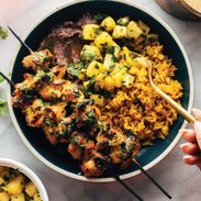 This was so delicious! I grilled the chicken skewers and made homemade yellow rice in the rice cooker. I also added some red onion and jalapeño to the pineapple salsa. An SOS meal but made it extra. We are absolutely making this again!
