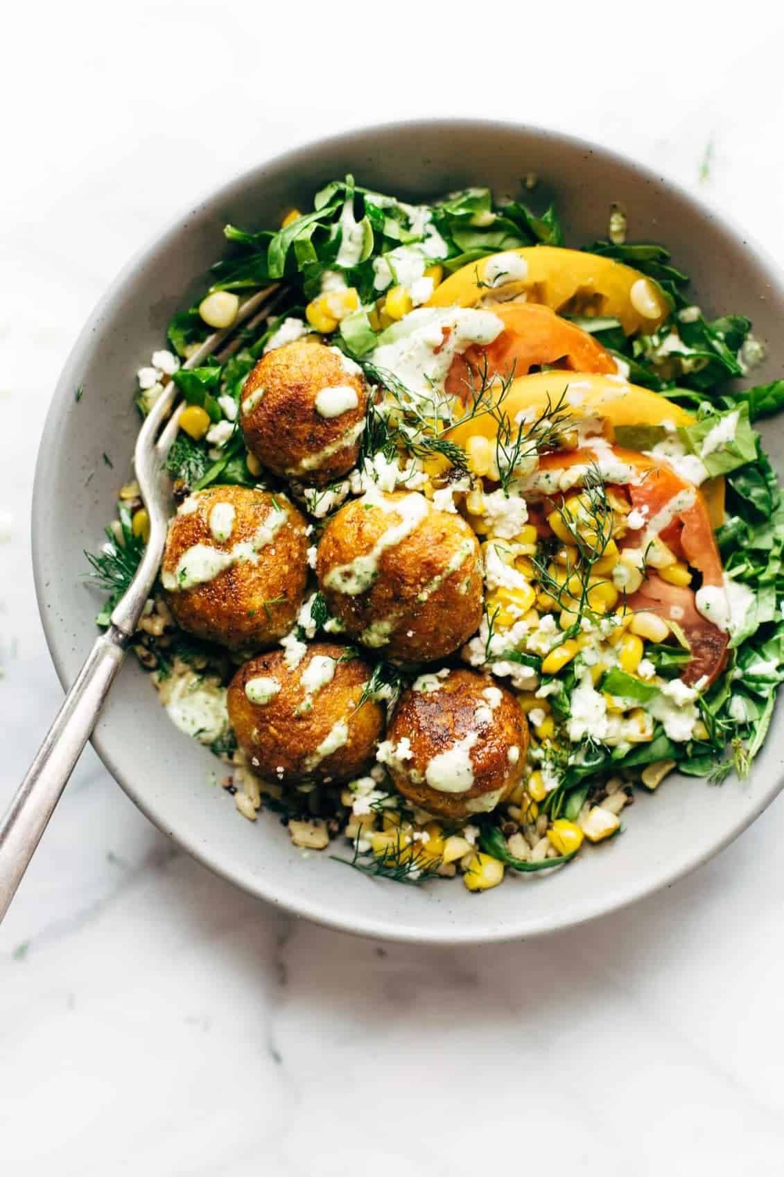 Summer Bliss Bowls with Sweet Potato Fritters and Jalapeño Ranch