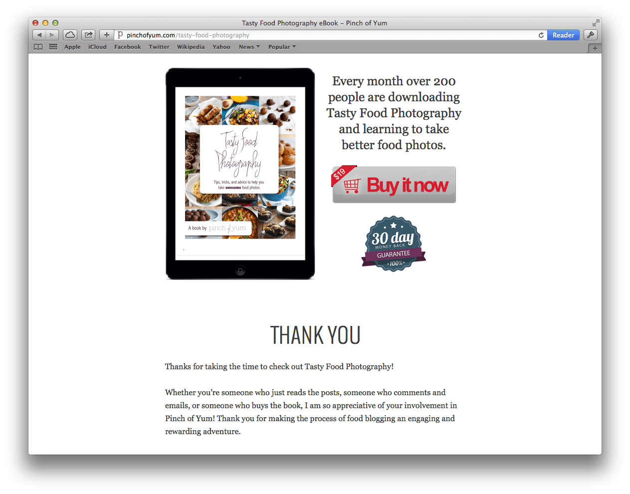 The two changes we made to strengthen our conversion coupling was to (1) change the header text of the landing page to read “Be Proud of Your Food Photos” and (2) include a cover image of the eBook.