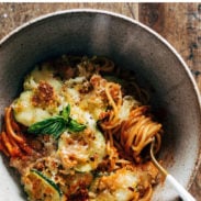 4. Serve the spaghetti in deep pasta bowls topped with a scoop of cheesy crispy zucchini and more fresh basil. Mwah.